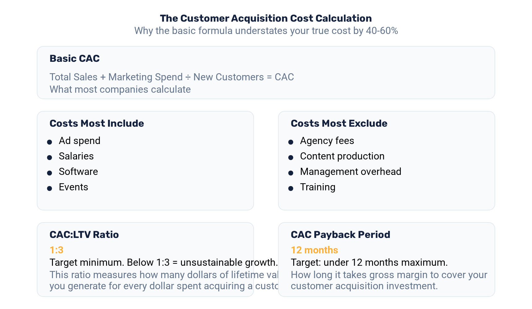 When you add these excluded costs back in, most companies discover that their true CAC is 30-50% higher than their reported number. A $5,000 reported CAC is often a $7,500 fully loaded CAC.