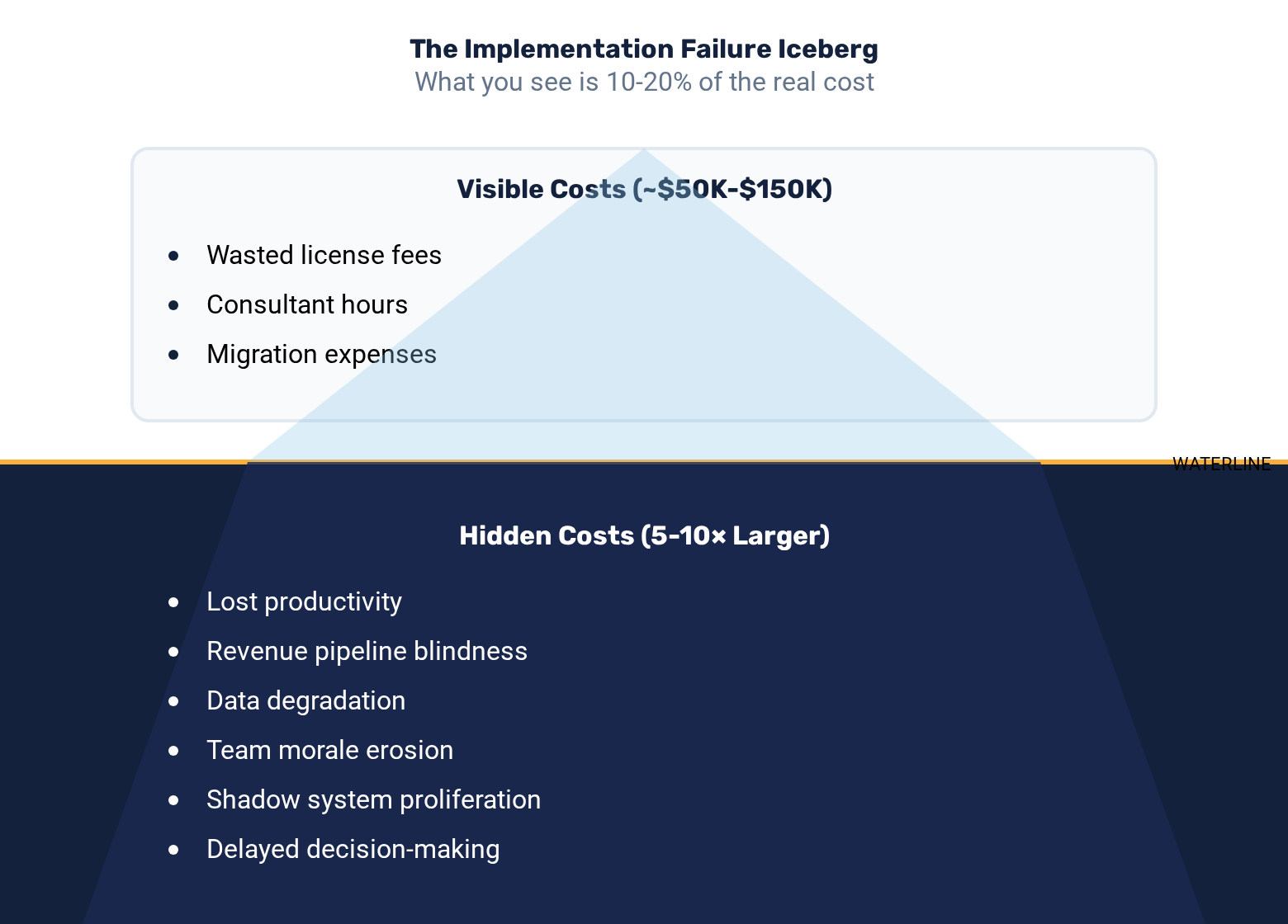 Team morale and trust erosion. This is the cost nobody puts on a spreadsheet but everyone feels. When you ask a sales team to adopt a new system and it fails, they become deeply skeptical of the next attempt. That skepticism translates to passive resistance, slower adoption, and a higher bar for the rescue implementation to clear.