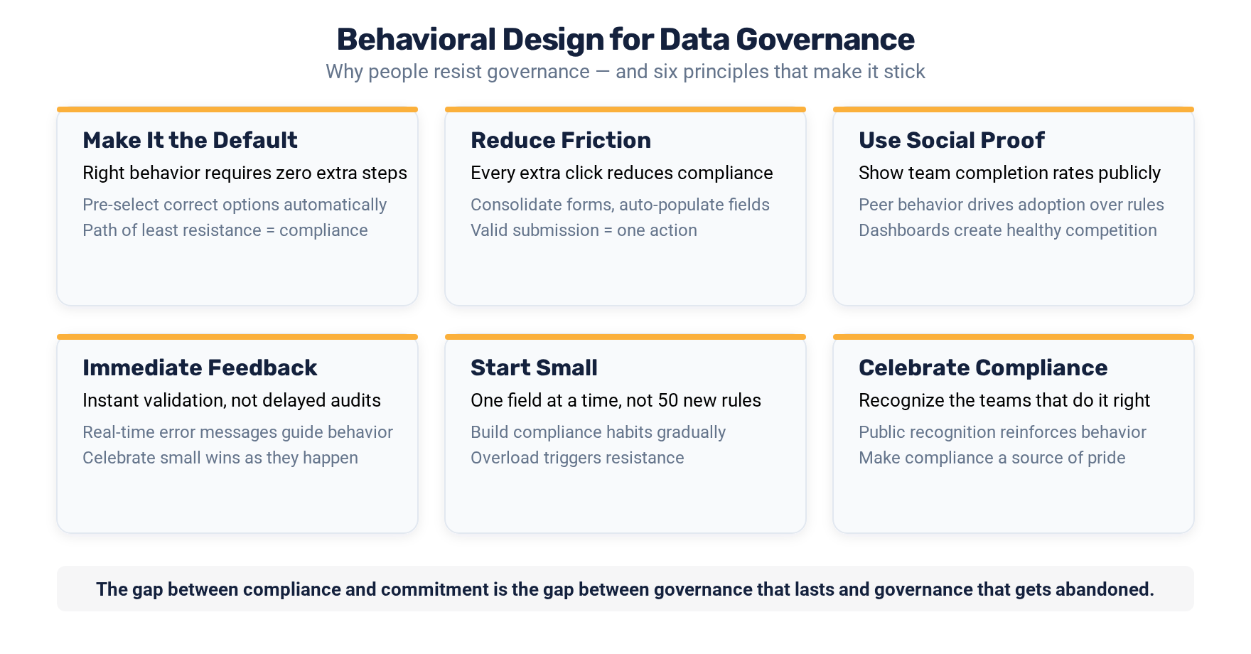 Effective data governance borrows from behavioral science — designing systems that make good behavior easy and bad behavior difficult.