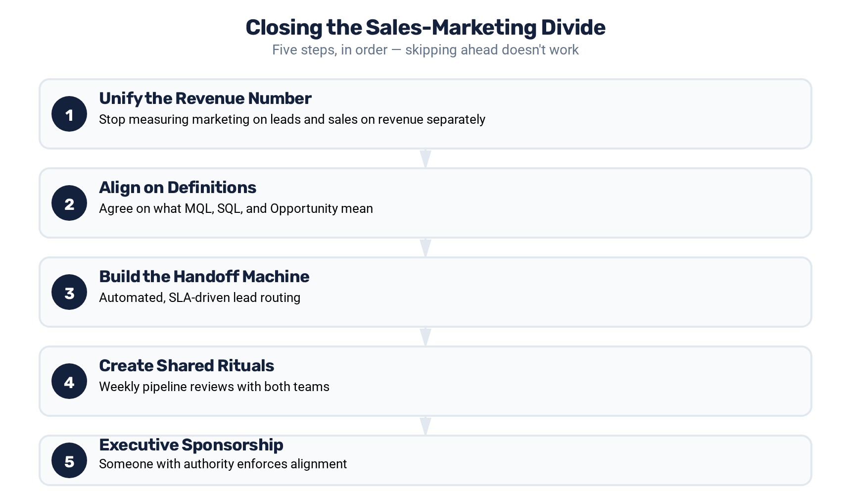 The sales-marketing divide will not close overnight. It took years to build and it will take quarters to dismantle. But every step toward alignment produces measurable revenue improvement. The companies that bridge this divide do not just perform better — they build a compounding advantage that misaligned competitors cannot replicate.